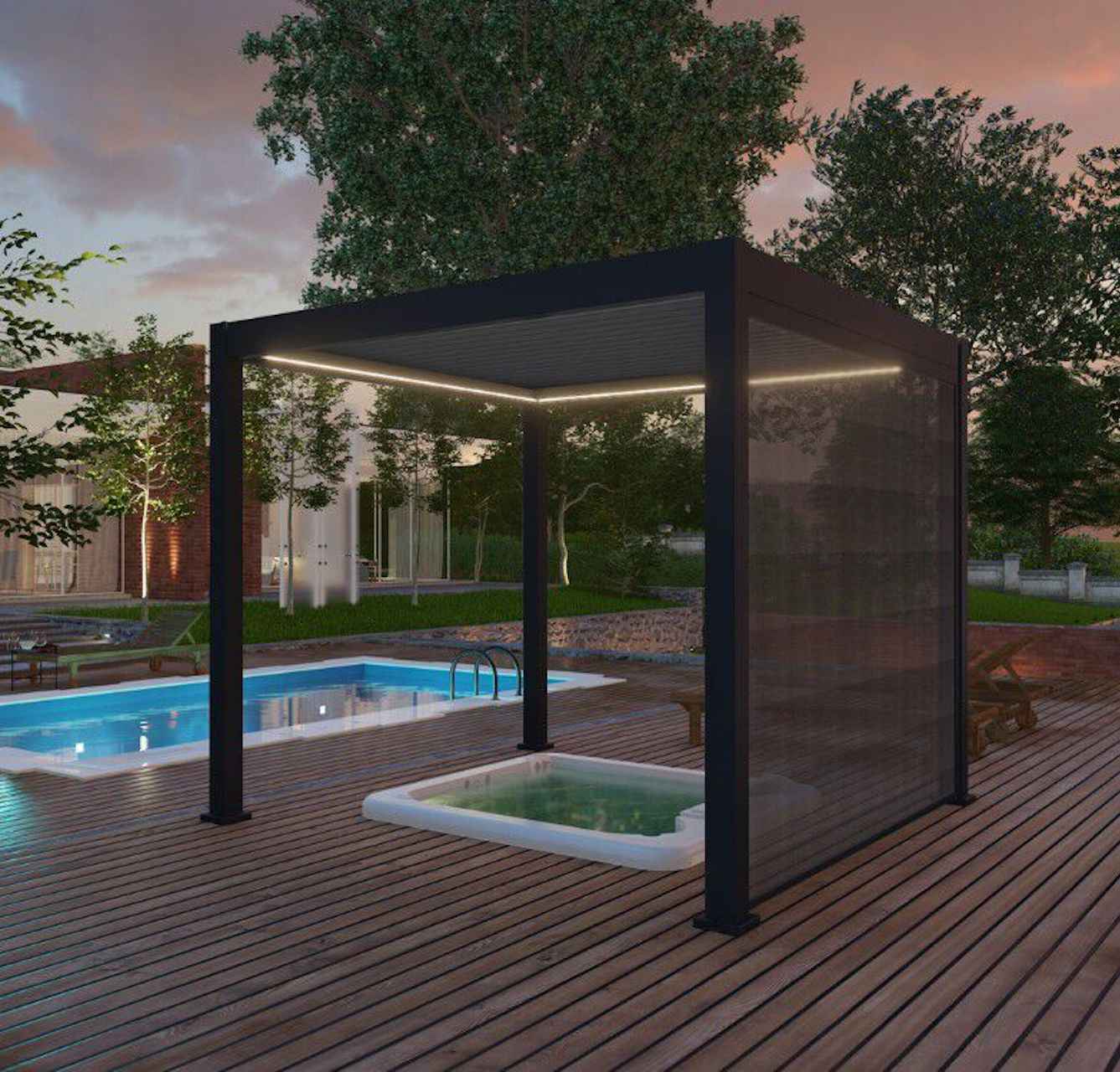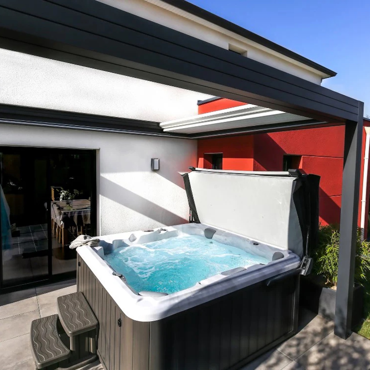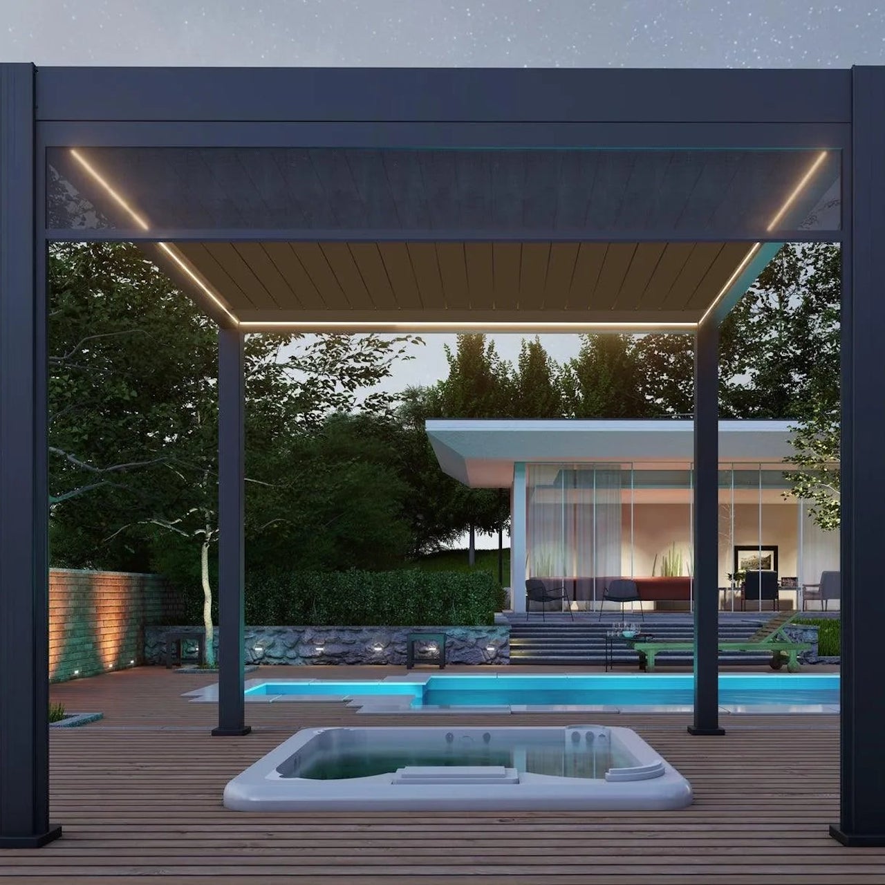 Elevate your outdoor experience with the Hot Tub and Swim Spa Company Pergola. Enjoy adaptable shade, LED lights, and motorized louvres in a stylish, weather-resistant design perfect for any small space.