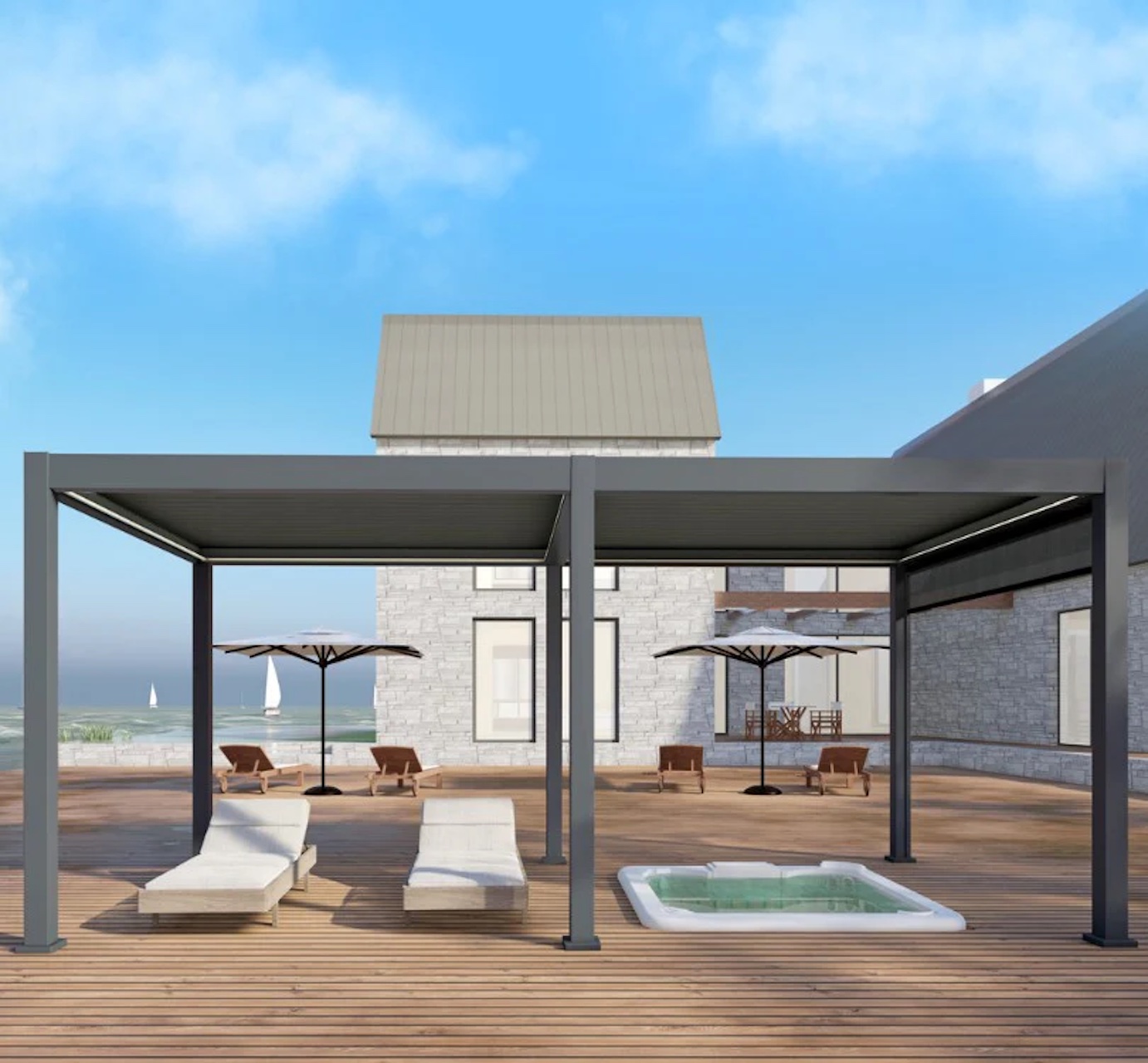 Elevate your outdoor space with this Hot Tub and Swim Spa Company Pergola. Enjoy its spacious, ultra-modern design, motorized louvre roof, LED lighting, and versatile shelter for large areas, perfect for dining, lounging, or housing a swim spa.